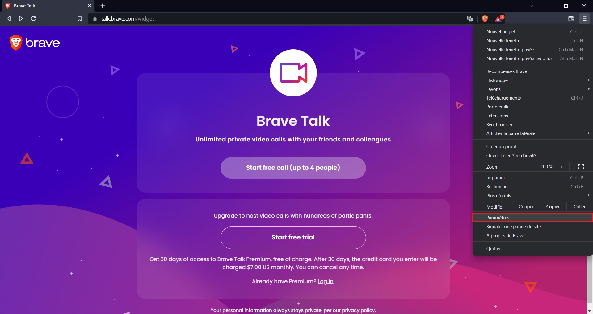 Passons à présent au paramétrage du navigateur. Pour ce faire cliquez sur les trois traits en haut à droite et cliquez sur Paramètres.